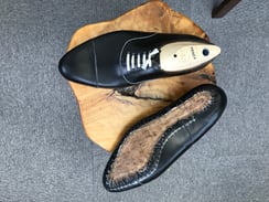 フィッティング用の靴を使って、3分割シューツリーの調整をしています。 この3分割シューツリーは、木型そのものをコピーして作られている為に靴にピッタリとフィットします。 金具や紐を取付ければ、お客さまへお渡しできる状態になります。