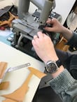 1足目の課題のOxford(内羽根)のアッパー製作では基本の手漉きでやっていただくのですが、2足目の課題であるDerby(外羽根)のアッパー製作では漉き機を使って頂きます。漉き機があれば奇麗な漉きが出来るとは限りません。漉く厚みのセッティングをする必要がありますし、靴の場合はカーブが多いので、足で速度調整をしながら手で革の送り出しを調整する必要もあります。これらの操作に慣れる必要があります。漉き機を使って漉きを行っても微調整は手漉きが必要となりますので、基本の手漉きがしっかり出来ることが重要ですね。