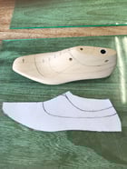 先ず最初に木型上に靴のデザインを描きます。この立体的なデザインをデザインテープなどを使って平面に写し取ります。写し取った結果が写真の物です。